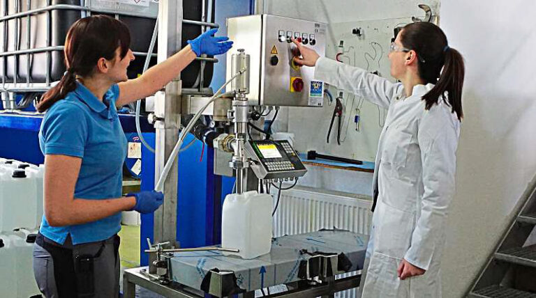 „Der Mischkopf hat eine sehr hohe Umdrehungszahl, durch die kleinen Schlitze ergibt sich eine sehr gute Vermischung, und der Motor ist gekapselt, es kann keinen Funkenflug geben, das ist sehr wichtig bei der Arbeit mit den explosiven Zutaten der Desinfektionsmittel“, erklärt Chemiker Dr. Klaus Hock. Vor gut drei Wochen seien die ersten Apotheker auf das Unternehmen zugekommen, das im Regener Gewerbegebiet Metten produziert, erzählt Geschäftsführer Franz-Josef Hock. Das Unternehmen ist Spezialist in Sachen Harz und alles rund um die Harzverarbeitung. Das heißt: Maschinen und Knowhow sind vorhanden, um Materialien zu mischen und abzufüllen. Und noch wichtiger: „Wir erfüllen, genauso wie Apotheken, die Voraussetzungen, dass wir Desinfektionsmittel produzieren dürfen“, erklärt Franz-Josef Hock. Dazu gehört, dass das Unternehmen die sachgemäße Herstellung garantieren kann, dass es das notwendige destillierte Wasser selbst herstellen kann und dass es ein Labor für die Qualitätsprüfung hat. Kein Großbehälter geht raus, ohne dass eine Probe gezogen und untersucht wird. Und natürlich muss die Zusammensetzung so sein, dass auch die Viren, speziell die neuartigen Corona-Viren, keine Überlebenschance haben beim Kontakt mit dem Desinfektionsmittel. Um die Hautverträglichkeit zu gewährleisten, wird dem Gemisch auch Glycerin zugesetzt.